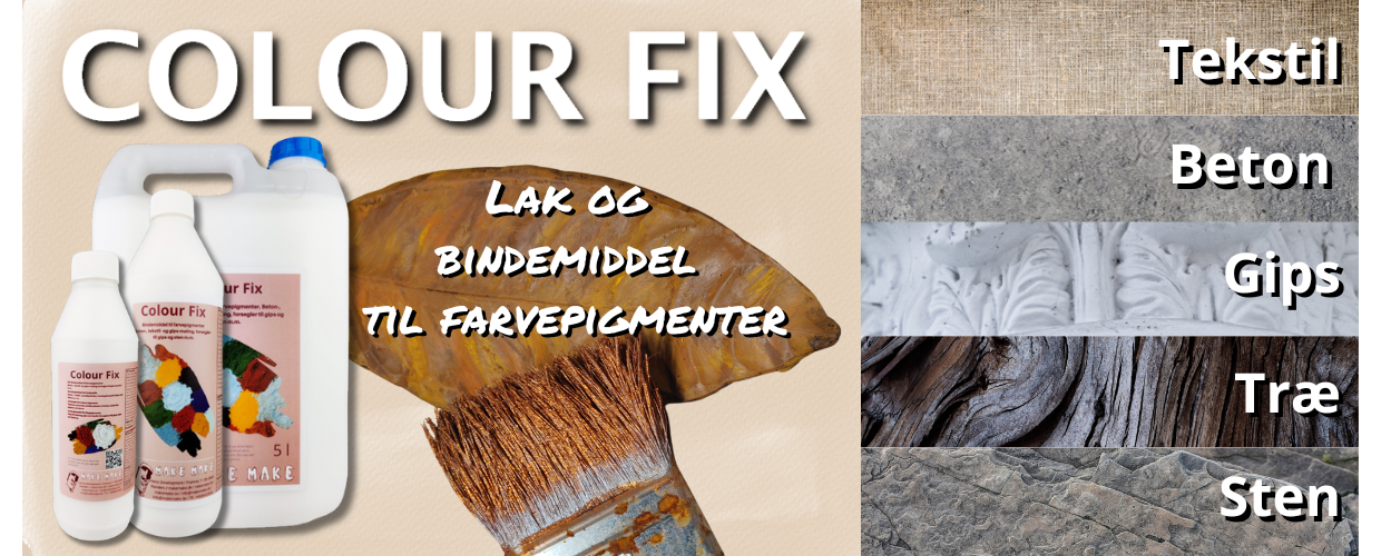 Med MakeMake kan du selv blande billig kvalitetsmaling. I kategorien Farver finder du farvepigmenter og bindemiddel (Colour Fix), så du selv kan blande din egen slidstærke maling til beton, gips og andre sugende overflader. Herved undgår du at betale for unødvendige tilsætningsstoffer i malingen.