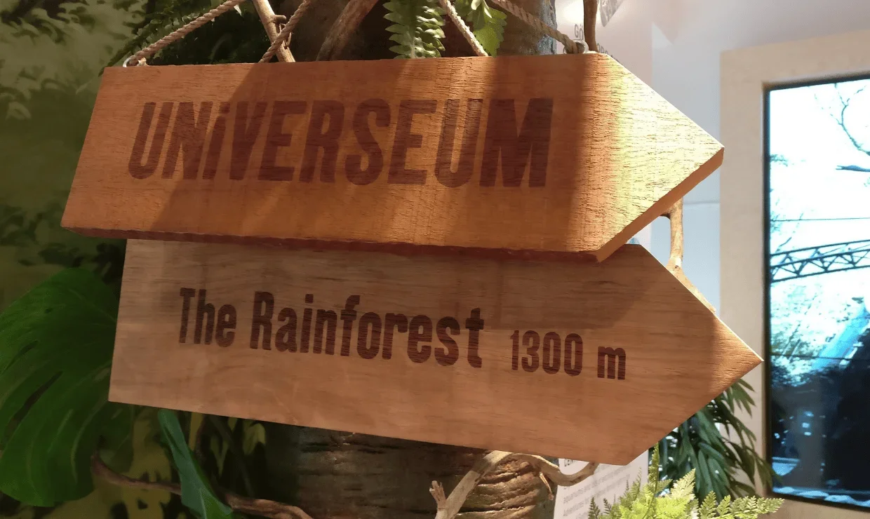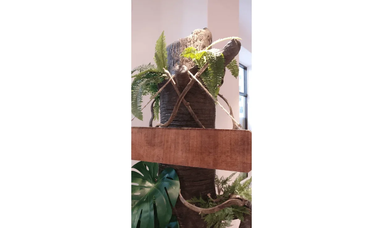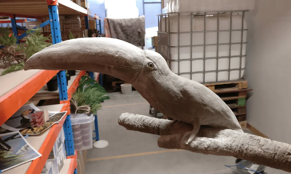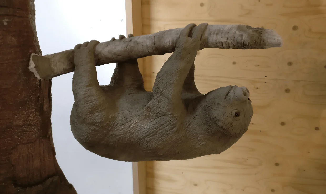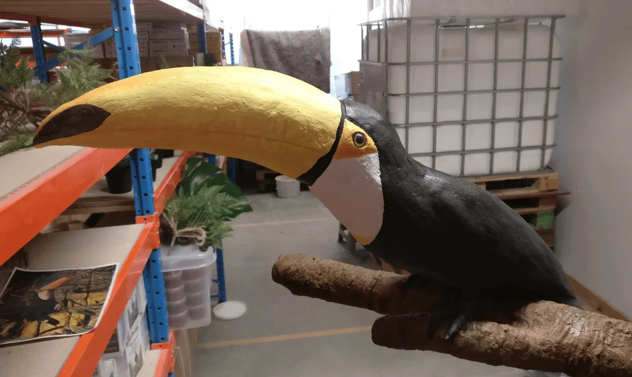 Dette kunstige brætrodstræ med tukan og dovendyr er lavet som udstilling til Gøteborg turistbureau.